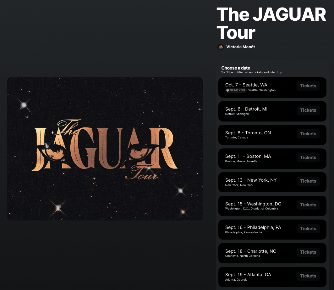 🎫 In July, Victoria created a multidrop to announce her 23 stop tour for JAGUAR II. This first wave of signups drew in thousands of phone numbers and emails with fans segmented by cities.