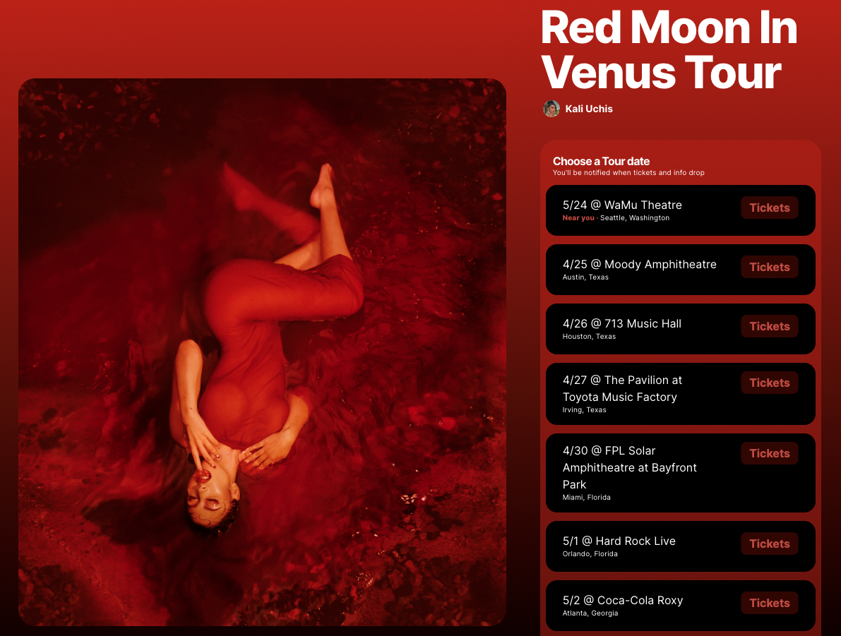💅 After 3 years since her last album, Kali Uchis started 2023 off with major news. She surprised fans with a double announcement: a new album and tour called "Red Moon in Venus". Kali posted a link to her Laylo multidrop in her IG story. She invited fans to RSVP and tens of thousands responded. For the next two days they anxiously waited for that special text with the presale code.