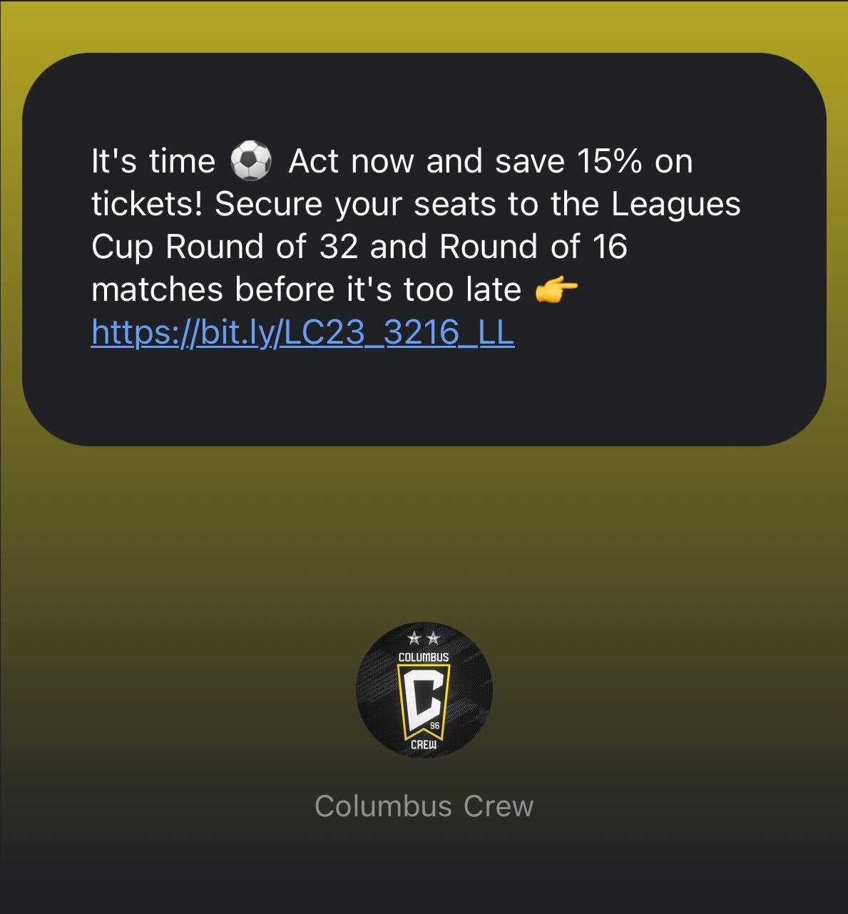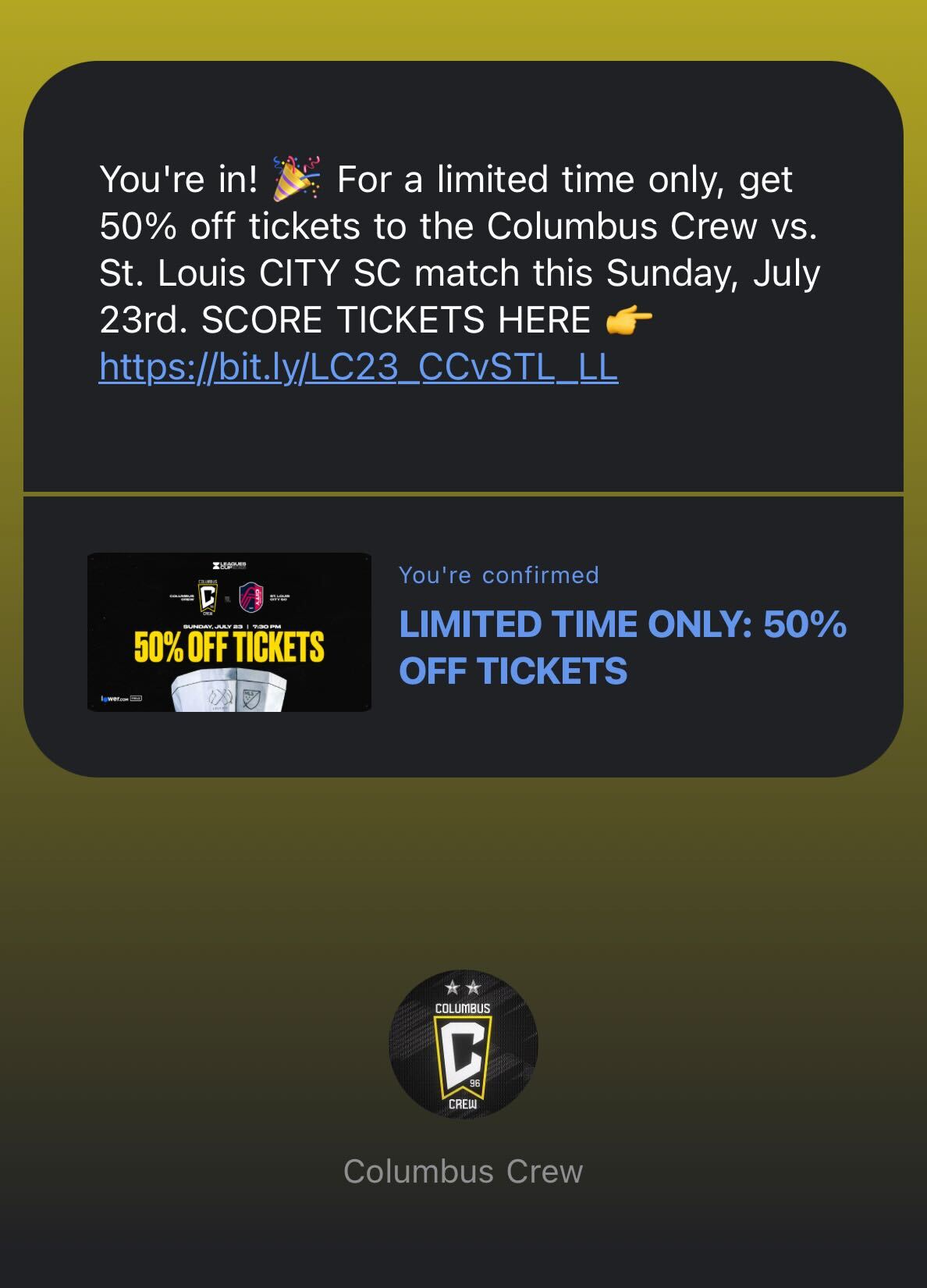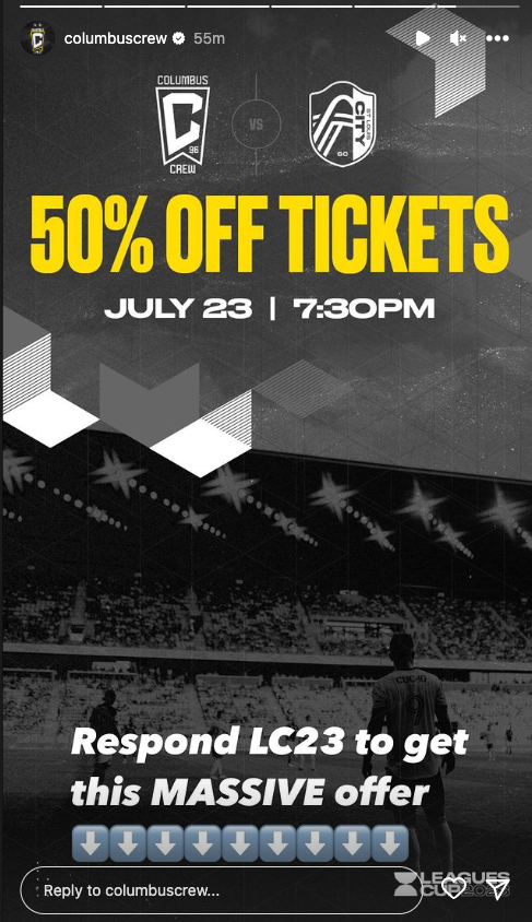 🤝 Columbus Crew posted an Instagram Story and encouraged fans to respond with key word LC23 to receive a 50% off ticket offer for their first Leagues Cup game.