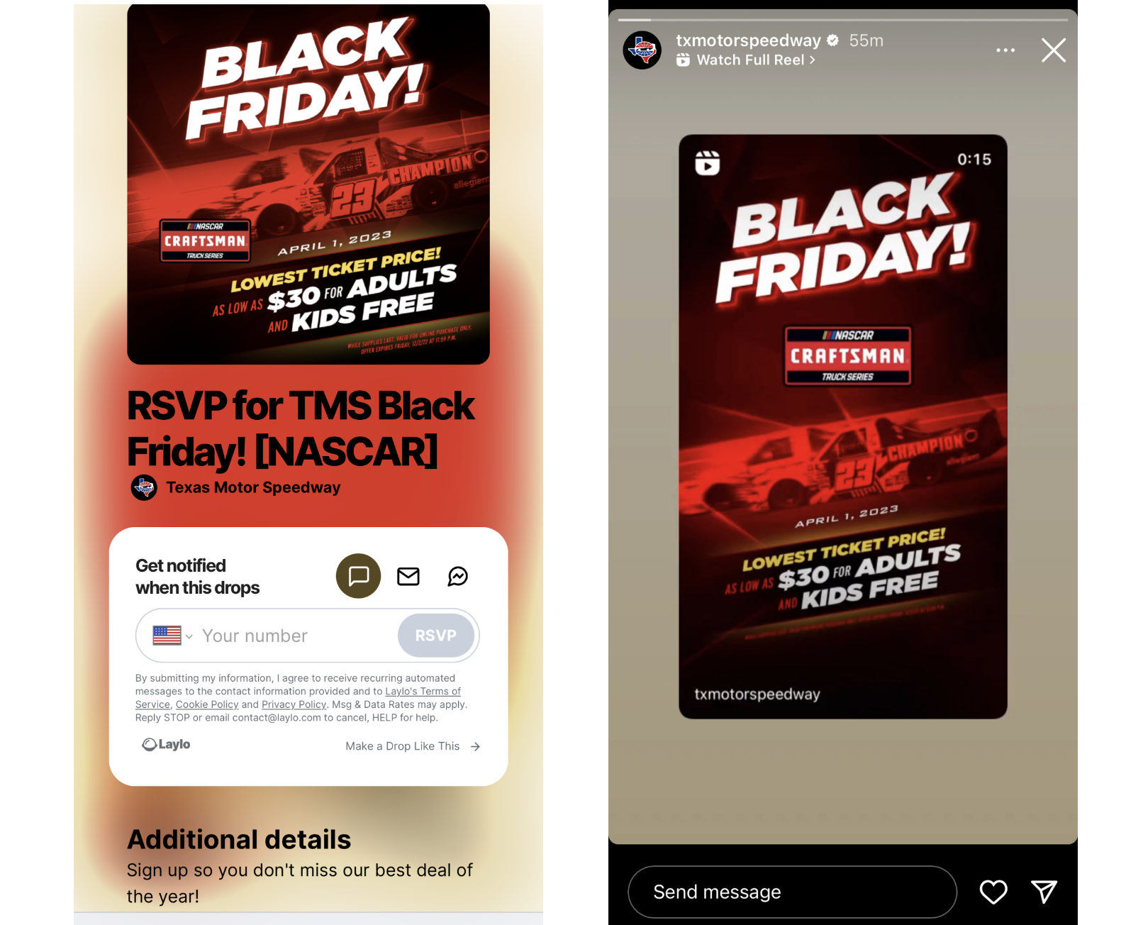 After building a list, the speedway promoted two Black Friday drops on Instagram. Fans who RSVP’d received early access to the Spring 2023 Texas Indy 375. This was an exclusive opportunity to get the lowest ticket price.