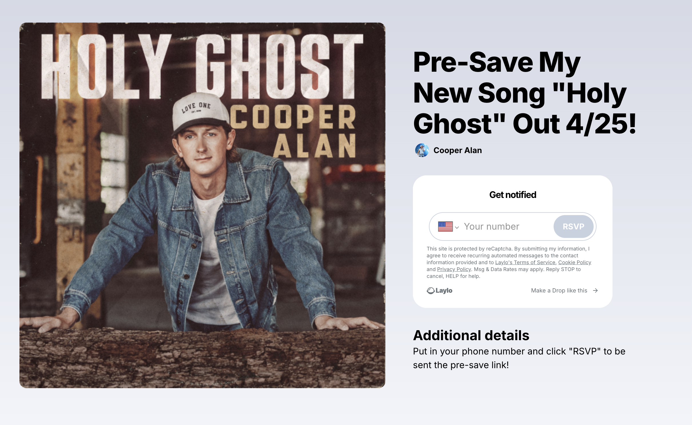 In addition to teasing snippets and exclusive previews, Cooper ran standard presave drops through Laylo to maximize first-day streams for his recent releases. When he announced a recent single, he shared a Laylo presave drop with fans, who clicked through to presave the track in just a few taps.