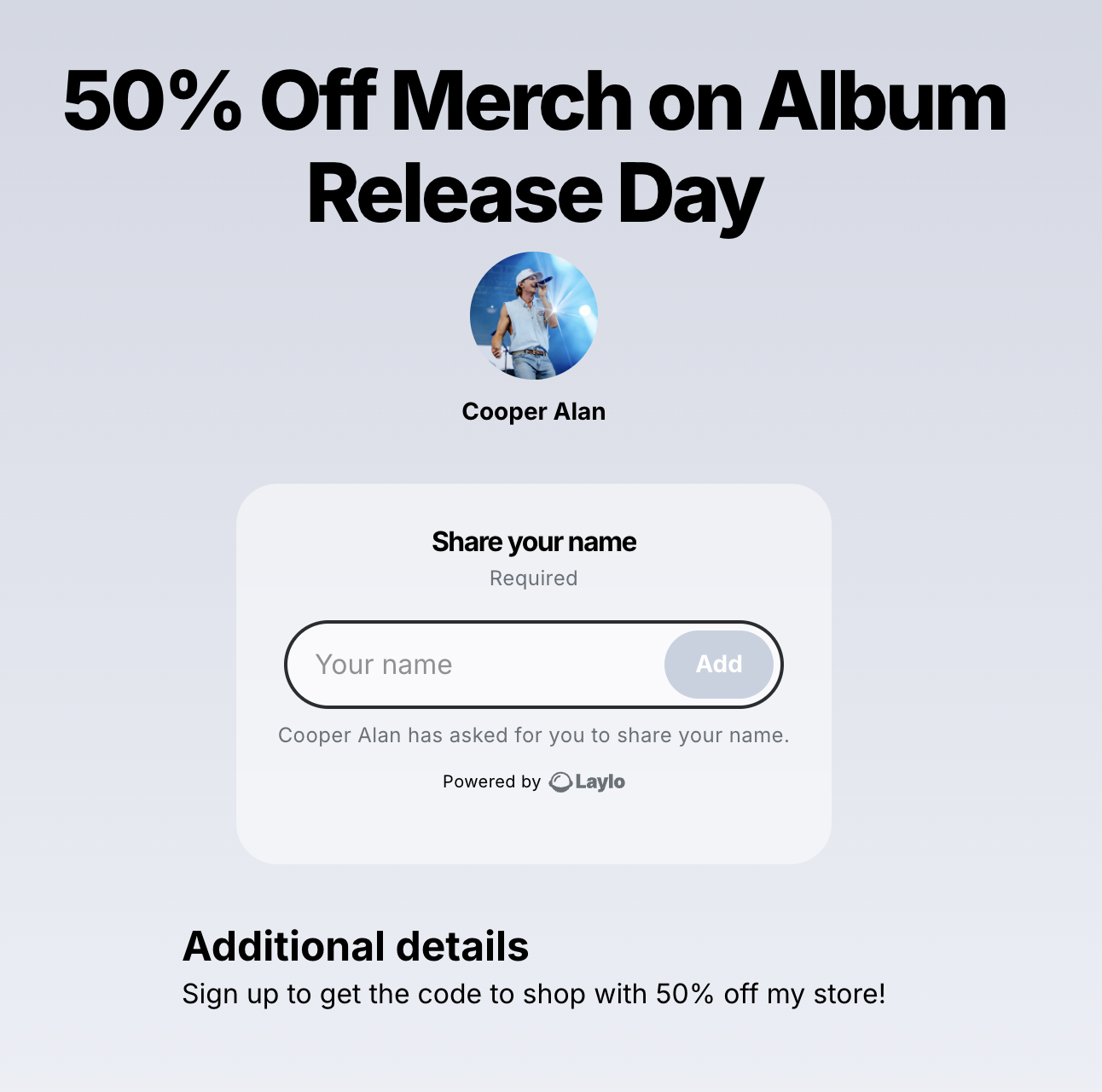 Cooper uses Laylo to run his releases, merch, touring, and giveaways in one place, and to build a fanbase he truly owns.