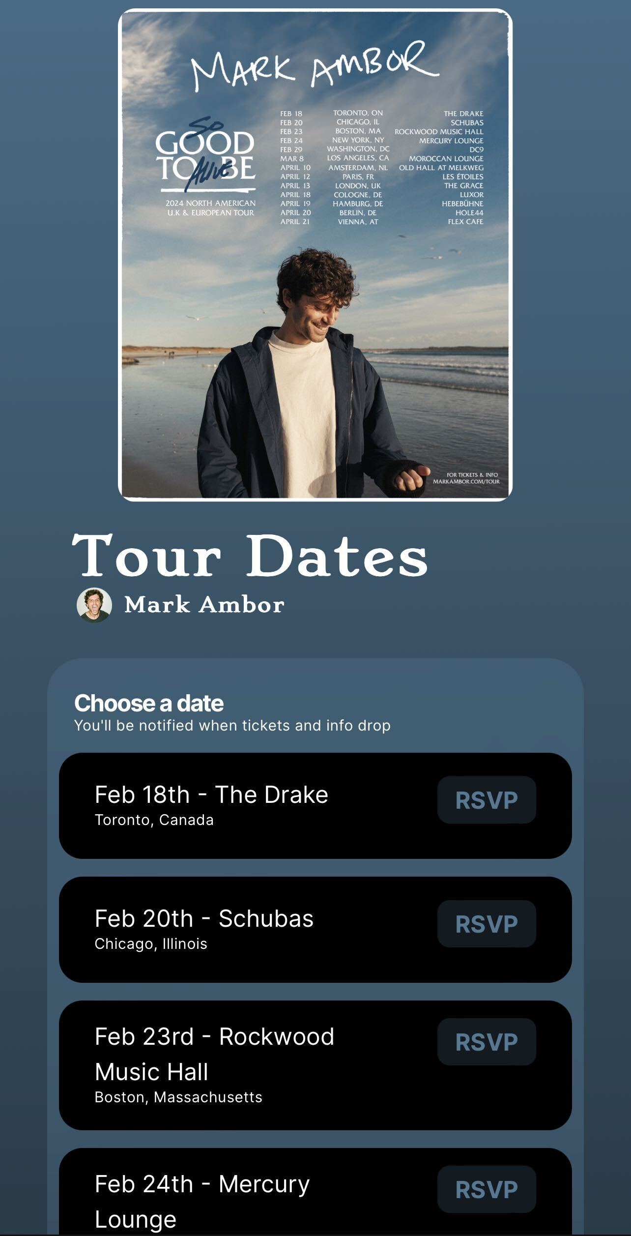 TENS OF THOUSANDS of fans RSVP'd for shows around the globe, begging Mark to come play in their city. The tour was a massive success, with multiple nights added in major marks and tons of momentum for Mark's next move.